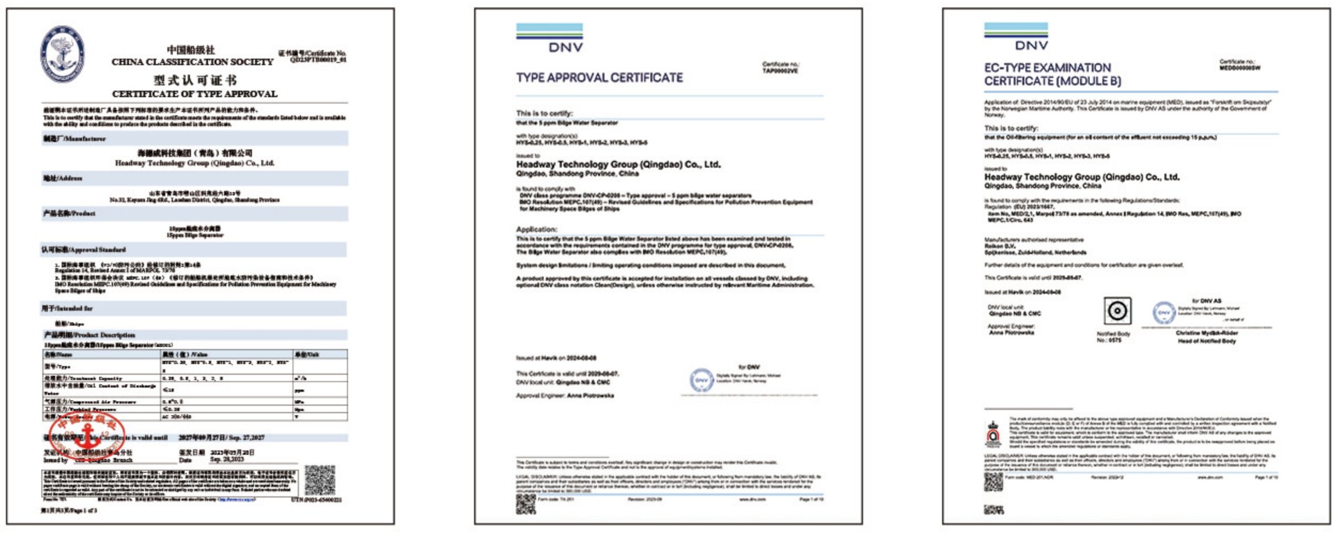 目前,海洋衛(wèi)士?艙底水分離器已取得CCS、DNV型式認(rèn)可證書和EC認(rèn)可證書。